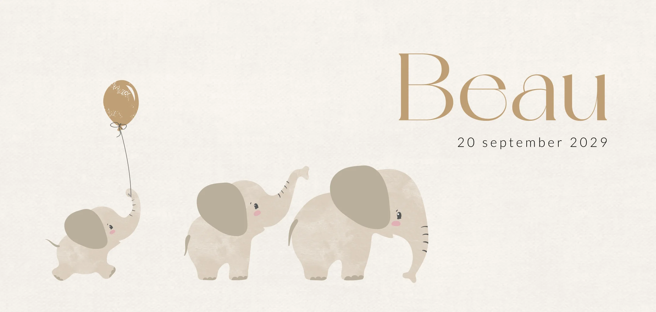 Unisex geboortekaartje voor een derde kindje, een broertje of zusje. Dit geboortekaartje Beau heeft een prachtig geïllustreerd ontwerp van schattige olifanten voor een jongen of meisje. Je ziet twee grotere olifanten en één klein olifantje met een ballon in zijn slurf. Pas dit geboortekaartje voor jullie zoon of dochter naar eigen wens aan in onze online editor. Met de bijpassende envelop in zandkleur en sluitzegel maak je dit geboortekaartje helemaal af.