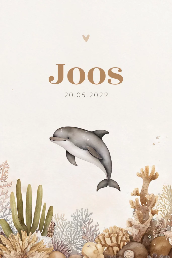 Een uniek en betoverd unisex geboortekaartje met onderwaterwereld thema voor een jongen of meisje. De prachtige aquarel illustratie van een dolfijn maakt van dit geboortekaartje Joos een opvallende verschijning. De ronde hoeken zorgen voor een extra speels effect. Pas dit geboortekaartje voor jullie zoon of dochter naar wens aan in onze online editor. De zandkleurige envelop en bijpassende sluitzegel maken het een compleet geheel.