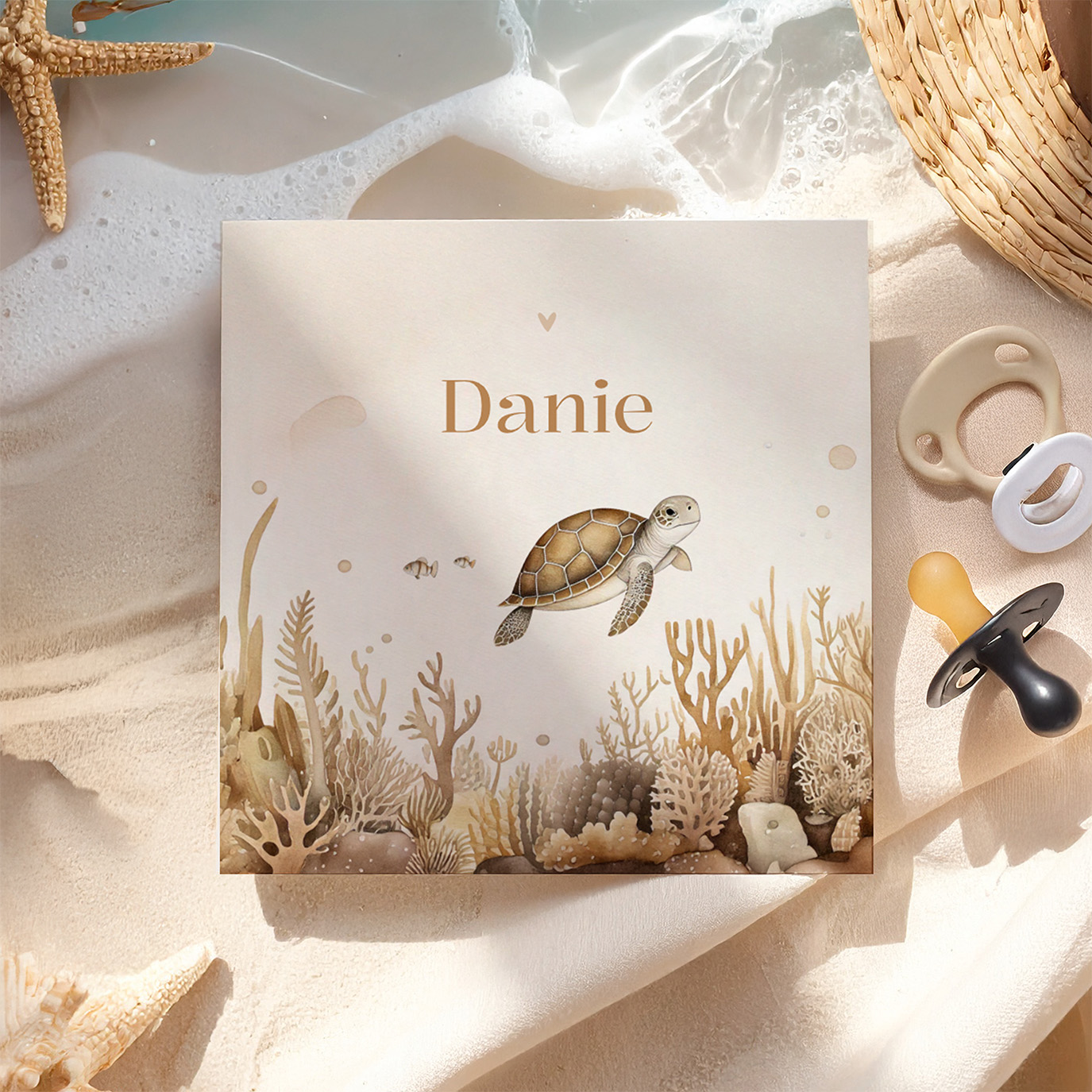 Dit unisex geboortekaartje met een schattige schildpad is perfect voor de aankondiging van de geboorte van jullie zoon of dochter. Dit geboortekaartje Danie heeft een onderwaterwereld thema waarbij je visjes, waterplanten en een schildpad ziet. Een geboortekaartje voor een jongen of meisje met neutrale kleurtinten. Pas dit kaartje aan in de online editor en sluit het kaartje in stijl af met de bijpassende metallic beige envelop en bijpassende schildpad sluitzegel.