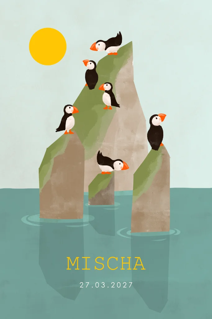 Dit is een unisex geboortekaartje met papegaaiduikers en rotsen in een klif bij de zee. Het kaartje is felgekleurd en heeft een stoere, avontuurlijke en zomerse uitstraling. Perfect voor een babyjongen of -meisje! Pas deze kaart Mischa naar je eigen smaak aan in onze ontwerpmodule.
