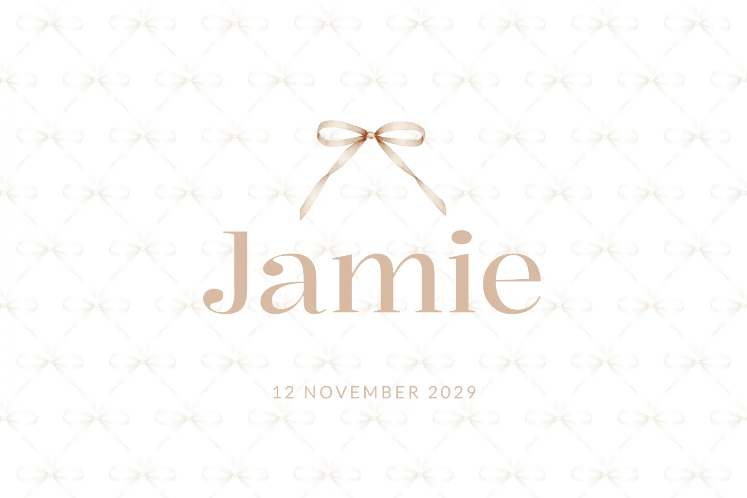 Klassiek unisex geboortekaartje voor een jongen of meisje. Dit geboortekaartje Jamie heeft een witte achtergrond met een patroon van beige strikjes. Het design en de kleurencombinatie geeft een klassieke uitstraling aan dit genderneutrale geboortekaartje. De ronde hoeken maken het helemaal af!