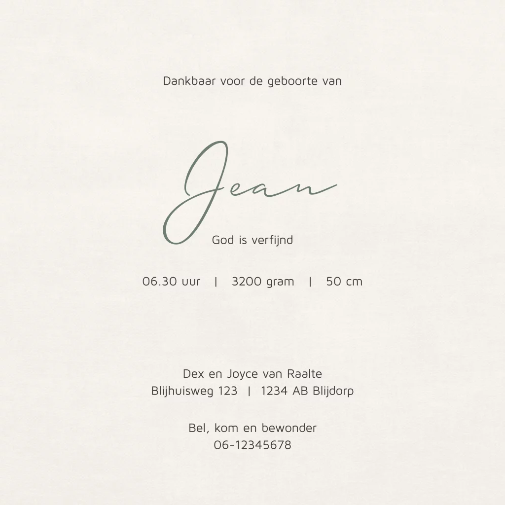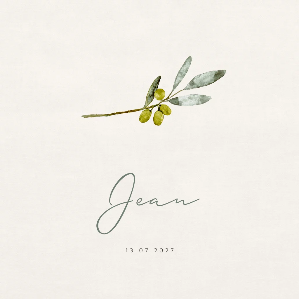 Christelijk en rustig geboortekaartje met botanische olijftak. Deze kaart Jean is neutraal en geschikt als jongens en meisjes babykaart. Aan de binnenkant van de kaart staat een bijbelse tekst.