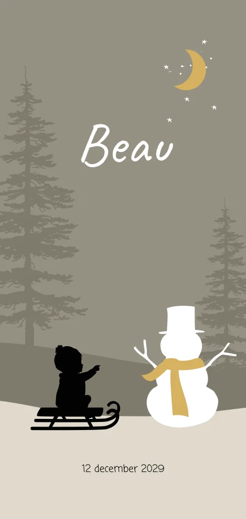 Dit unisex geboortekaartje Beau is perfect voor een winter baby en heeft een warme, natuurlijke uitstraling door de neutrale kleuren. Je ziet een silhouet van een kindje op een slee door de sneeuw met een sneeuwpop, boom en maan op de achtergrond. De teksten op het kaartje kun je gemakkelijk aanpassen naar jouw wensen. Ook mogelijk met een ander silhouet of voor een andere gezinssamenstelling. Heb je vragen of opmerkingen? Wij helpen je graag verder!