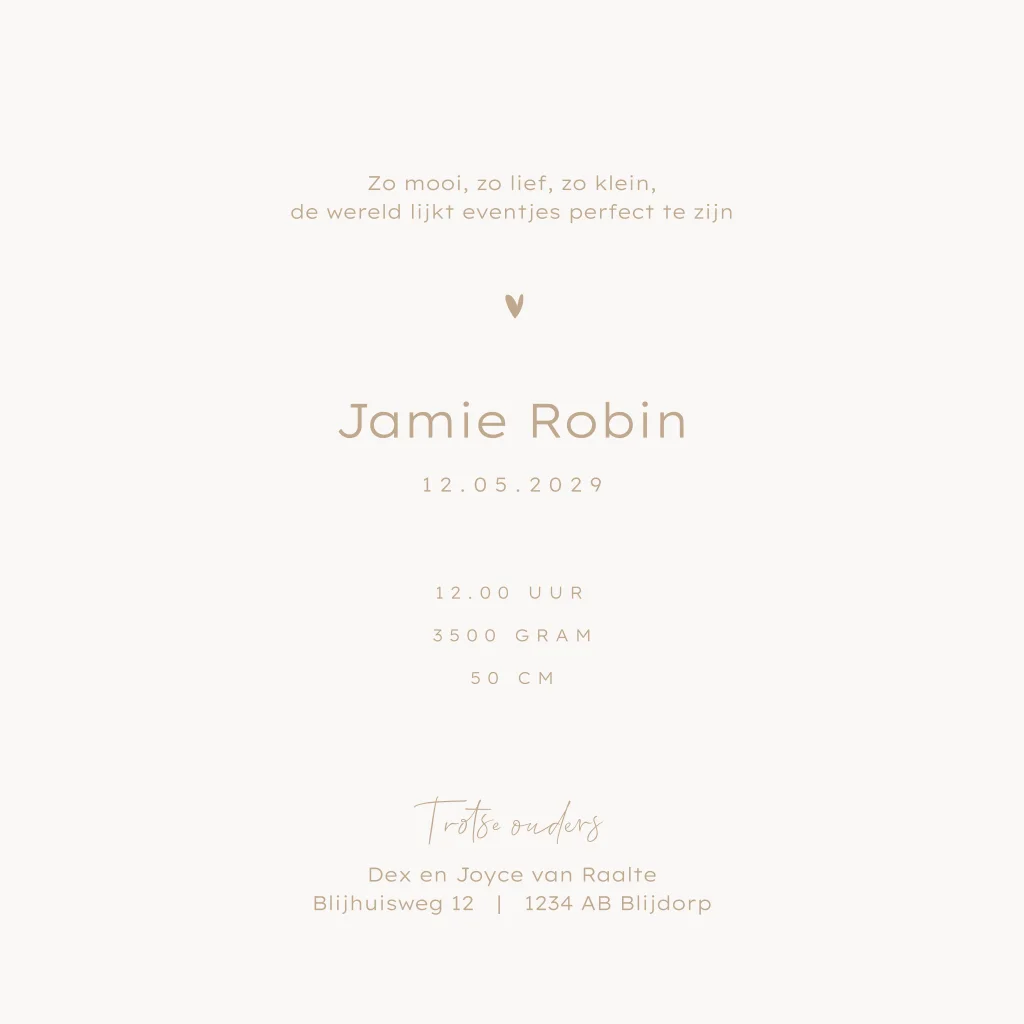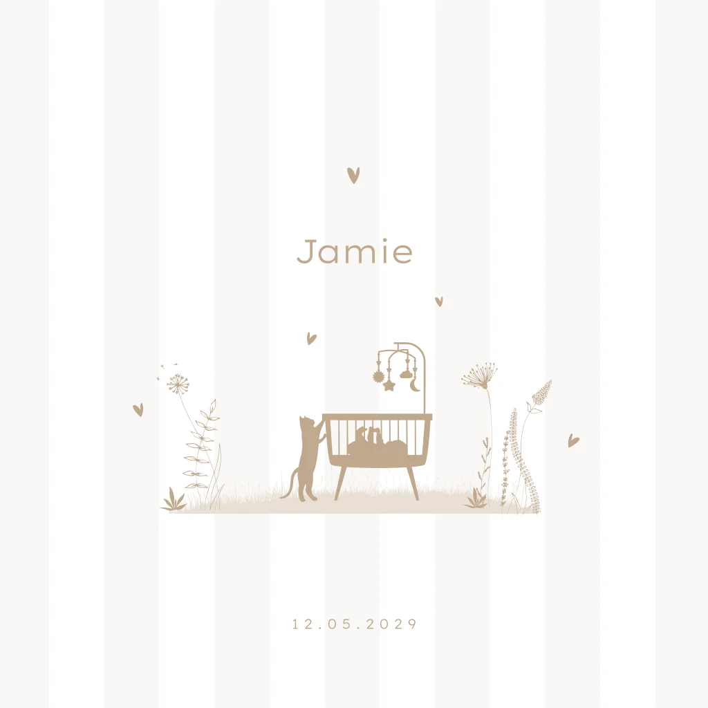 Unisex geboortekaartje in trendy beige kleuren met hippe strepen op de achtergrond. Op dit neutrale geboortekaartje Jamie zie je een silhouet van een wiegje met baby. Een kat kijkt nieuwsgierig naar het wiegje. Helemaal leuk voor gezinnen die hun huisdier willen betrekken bij het geboortekaartje. De bloemen en hartjes maken het helemaal af en geven een lieve touch aan dit unisex geboortekaartje voor een jongen of meisje.