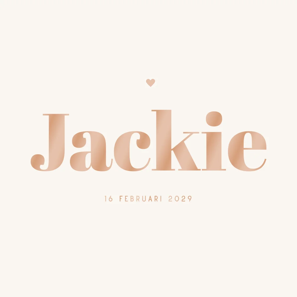 Dit neutrale geboortekaartje Jackie is perfect voor zowel een jongen of meisje. Het kaartje heeft een beige achtergrond met in spot-uv hoogglans lak de naam van jullie zoon of dochter. Met een basic design komt de babynaam op het geboortekaartje nog mooier tot zijn recht. Pas de teksten, kleuren en lettertypes naar je eigen smaak aan in de editor. Ook kun je zelf bepalen of je ronde hoeken wilt. Kijk voor de prijzen en meer informatie over kaartjes met ronde hoeken op de pagina geboortekaartjes met ronde hoeken