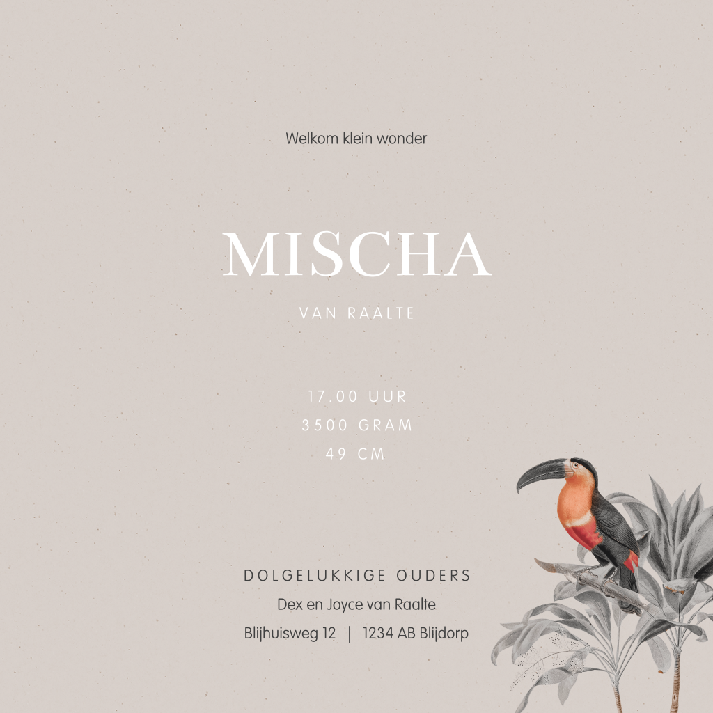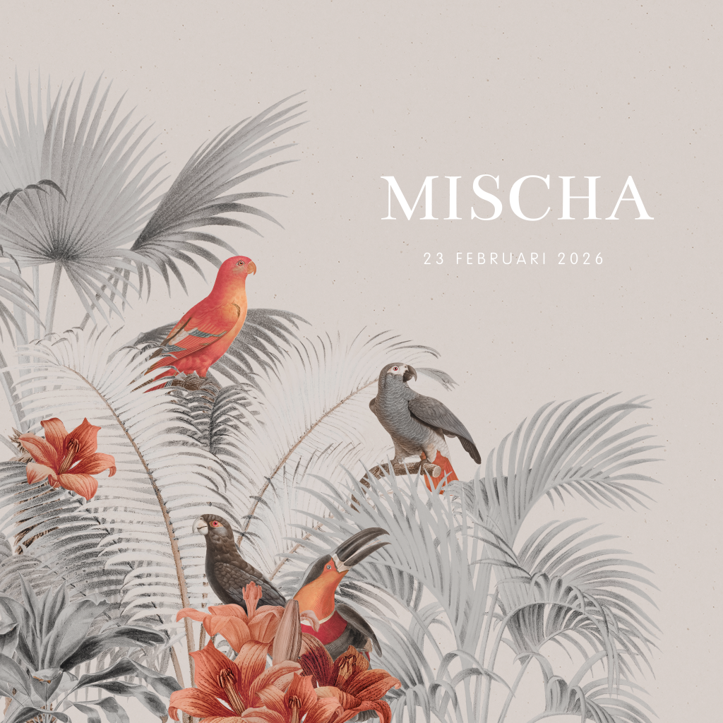 Vintage genderneutraal geboortekaartje voor jullie zoon of dochter. Op dit babykaartje Mischa verschillende tropische bloemen en papegaaien. De grote bladeren op de achtergrond maken het jungle sfeertje compleet. Kleuren, teksten en lettertypes pas je eenvoudig aan in onze editor. Vragen of wensen? Bel, mail of chat gerust!