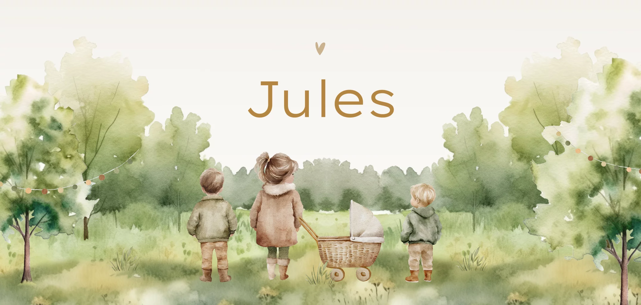 Unisex geboortekaartje voor een vierde kindje, een broertje of zusje. Dit geboortekaartje Jules heeft een prachtig aquarel getekend ontwerp van een bos landschap met vier kindjes, de grote broers en zussen met hun kleine baby broertje of zusje. Het kindje ligt in een kinderwagen.