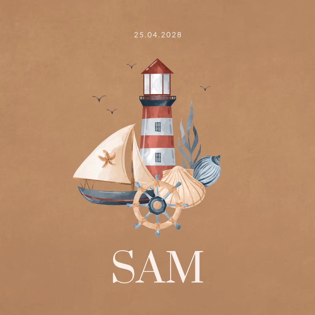 Unisex geboortekaartje voor een jongen of meisje in zee thema met vuurtoren, zeilboot, roer en schelpen. Dit geboortekaartje Sam is perfect voor stoere avonturiers of ouders die van de zee of zeilen houden. Pas het geboortekaartje eenvoudig aan in de editor.