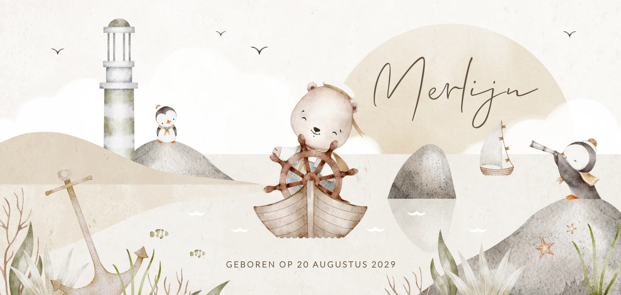 Op zoek naar een uniek geboortekaartje? Dit kaartje Merlijn is door de neutrale kleuren perfect voor zowel een jongen als een meisje. De kaart is rijk geïllustreerd met een zeelandschap met rotsen, meeuwen en vuurtoren. In de boot vaart een beertje. Op de achtergrond gaat de zon onder tussen de wolken. Pas dit geboortekaartje geheel naar eigen wens aan in de editor. Hulp nodig? Bel, mail of chat ons gerust. Wij helpen je graag!