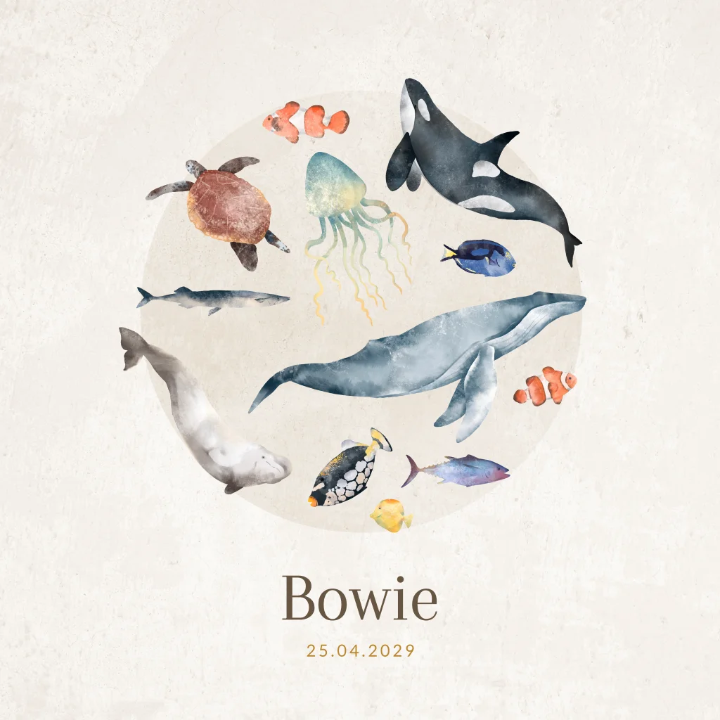 Dit schattige geboortekaartje is perfect voor jouw kleintje. Op dit unisex geboortekaartje Bowie zie je allerlei dieren die in de zee leven. Denk aan een walvis, een schildpad, vissen en een orka. Dit geboortekaartje is perfect als je van de zee en dieren houdt. Pas dit geboortekaartje eenvoudig aan in de editor.