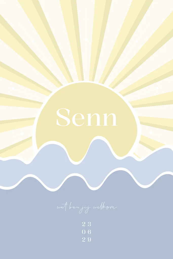 Een vrolijk unisex geboortekaartje voor een jongen of meisje. Dit geboortekaartje Senn voor jullie zoon of dochter heeft een kleurrijk design met een stralende zon en golvend water. Het goudfolie en de ronde hoeken zorgen voor een luxe touch. De eco tulp envelopkleur maakt deze kaart helemaal in stijl af. Hulp nodig? Ons team staat voor je klaar.