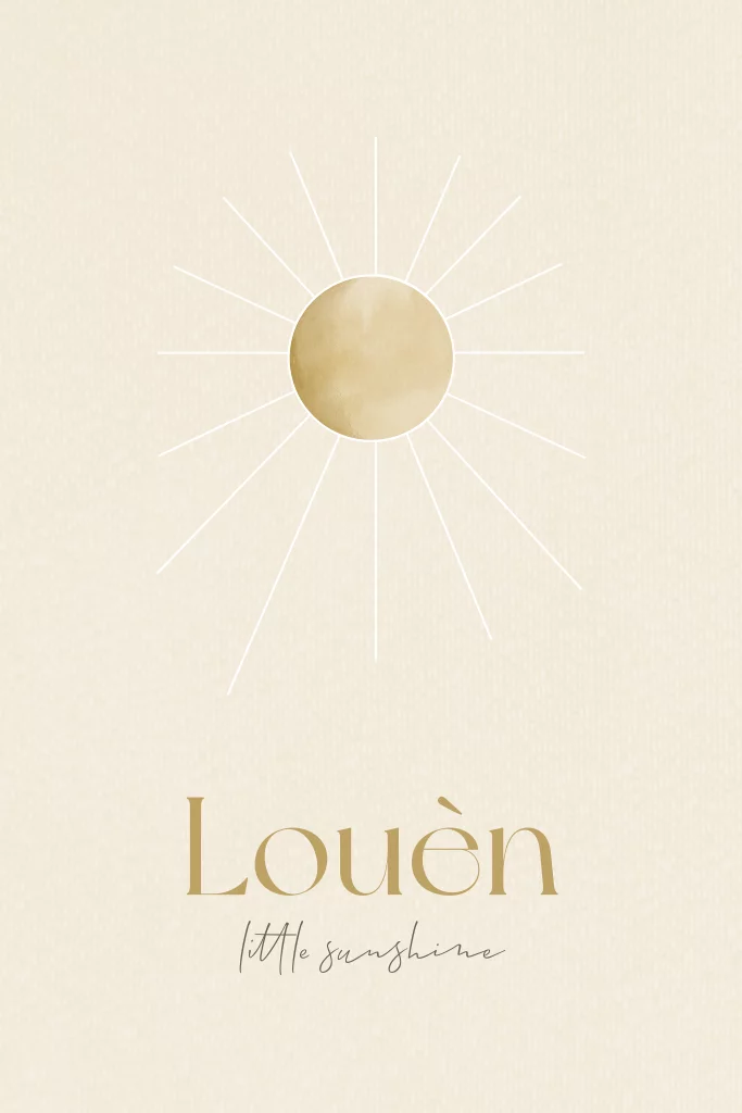 Prachtig unisex geboortekaartje voor een jongen of meisje. Op dit neutrale geboortekaartje Louèn met afgeronde hoeken zie je een mooie aquarel tekening van een zon met zonnestralen. De kaart heeft neutrale kleuren waardoor deze geschikt is voor zowel een zoon of dochter. Je kunt de kaart naar je eigen wensen aanpassen in de editor. Hulp nodig bij het ontwerpen? Neem contact met ons op!