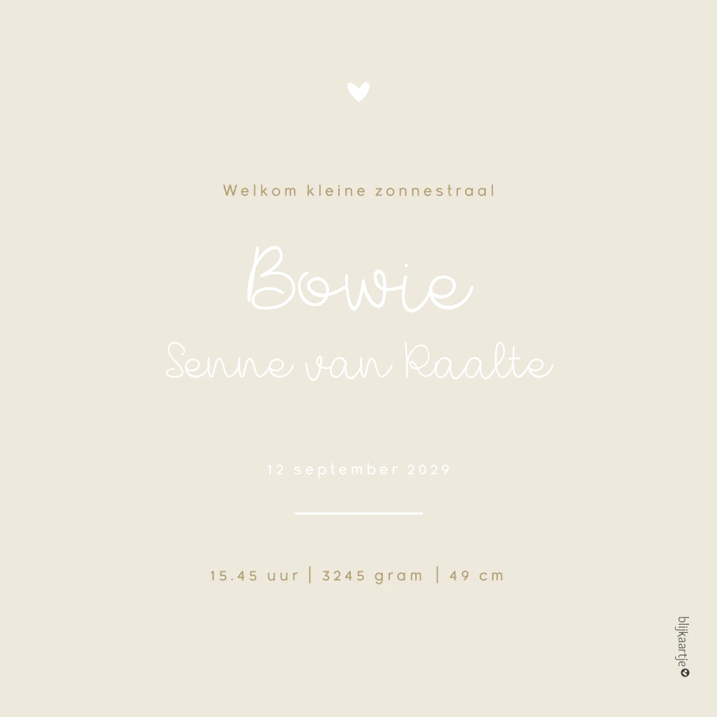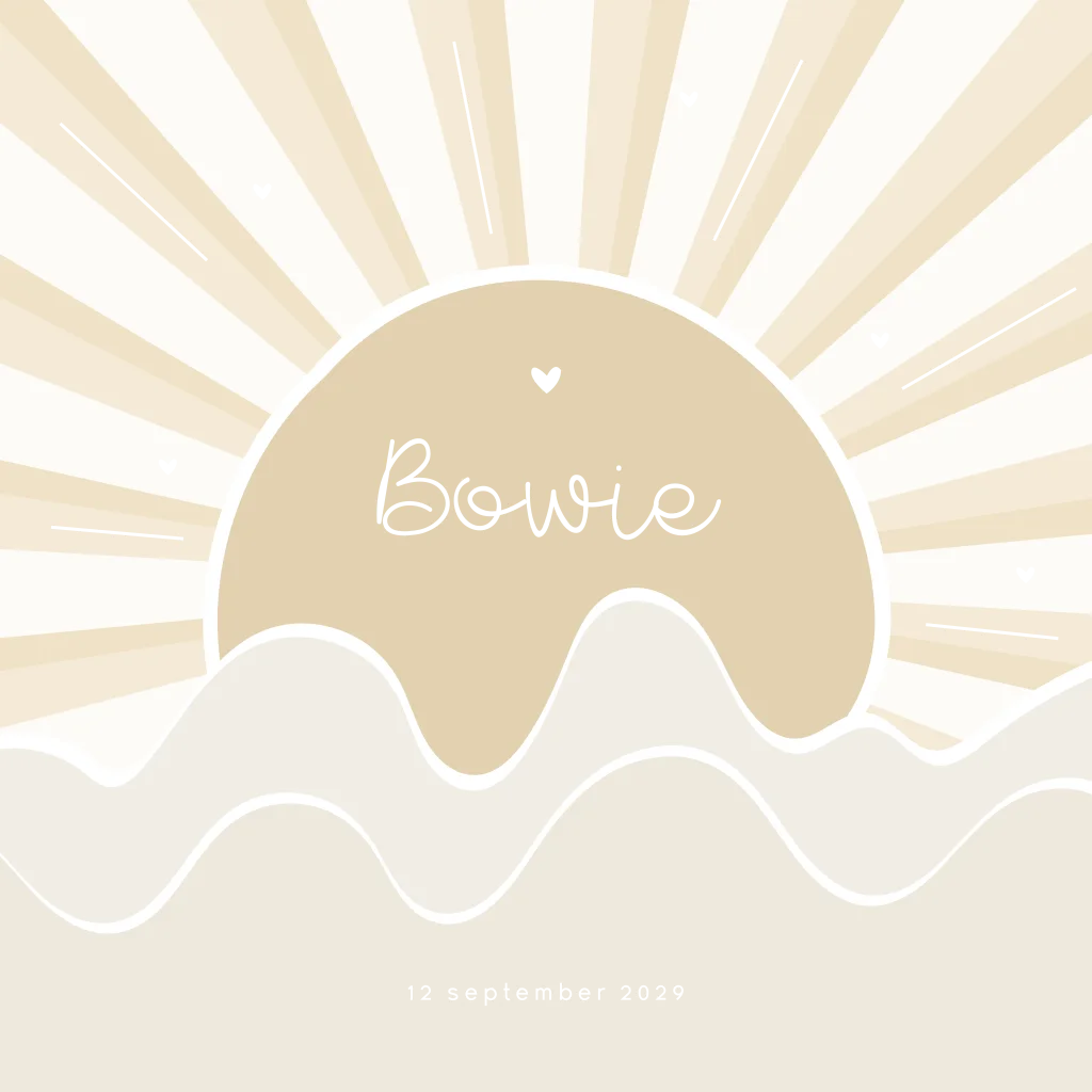 Een lief unisex geboortekaartje voor een jongen of meisje. Op dit geboortekaartje Bowie zie je een stralende zon met hartjes en golvend water in beige en bruine kleurtinten. Het goudfolie zorgt voor een extra vleugje luxe. Geheel naar eigen wens aan te passen in de online editor. De biotop envelopkleur maakt dit geboortekaartje voor jullie zoon of dochter helemaal in stijl af.