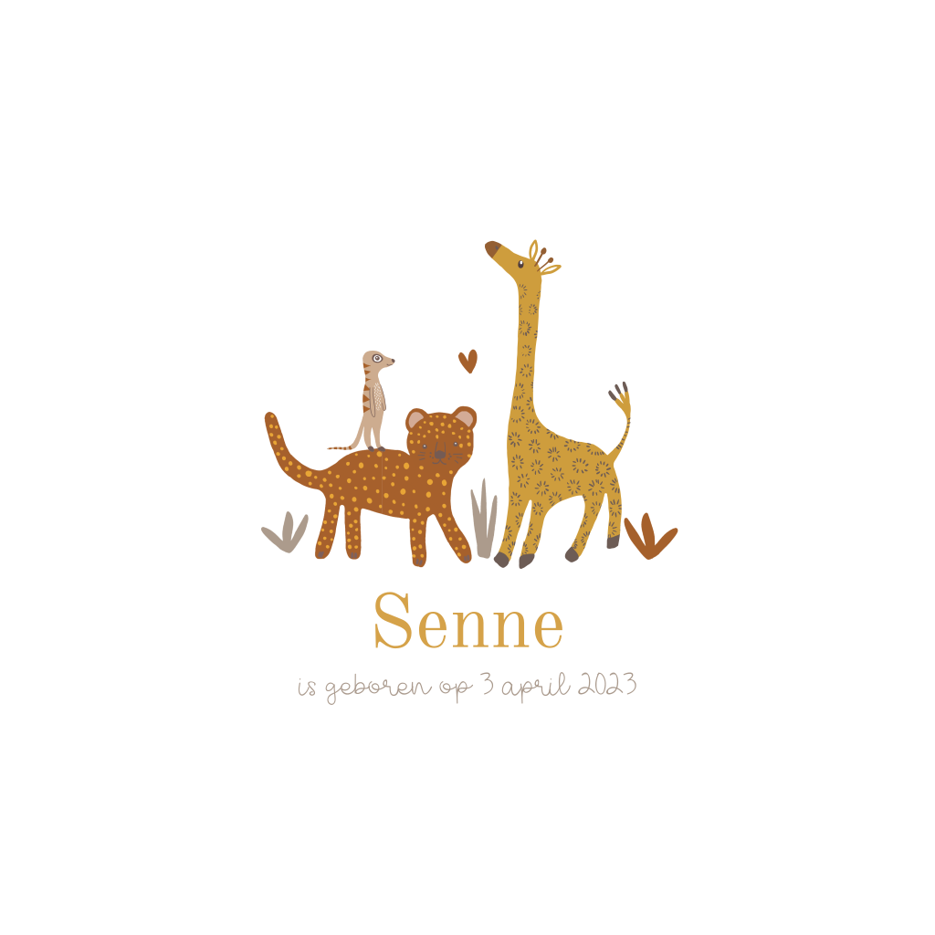 Een clean unisex geboortekaartje met de jungle dieren giraffe, stokstaartje en luipaard. Pas dit kaartje naar je eigen wensen aan de de editor.