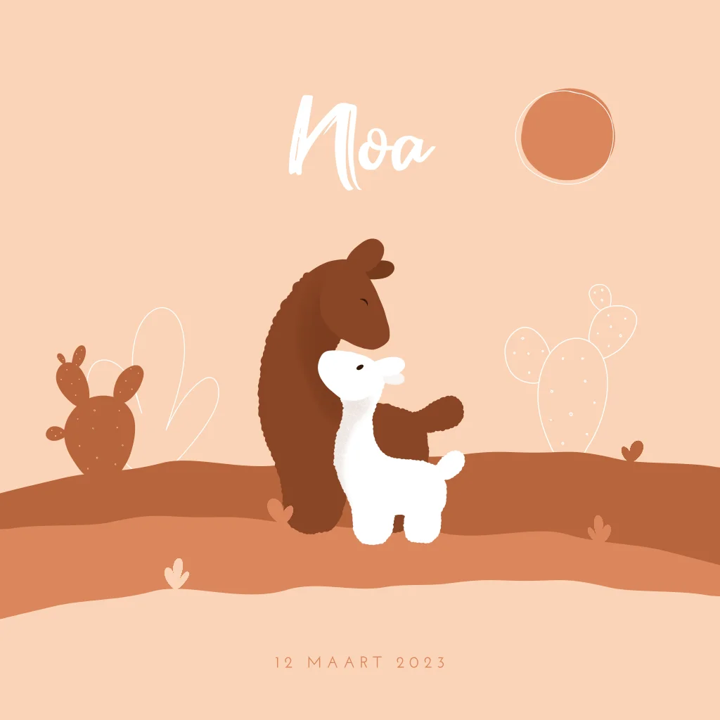 Geboortekaartje met een moeder lama en een baby lama in de woestijn. Dit babykaartje Noa is zowel voor een jongen als voor een meisje geschikt, oftewel een unisex kaartje.