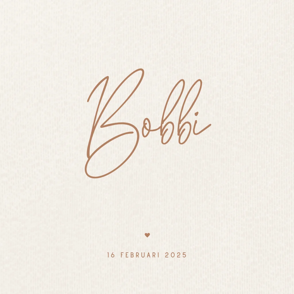 Rustig neutraal geboortekaartje voor zowel een jongen als een meisje met een beige achtergrond met subtiele lijntjes, en een klein hartje. De ronde hoeken maken dit basic unisex babykaartje Bobbi extra speciaal. Pas de teksten, kleuren en lettertypes naar je eigen smaak aan in de editor. Ook kun je zelf bepalen of je ronde hoeken wilt.