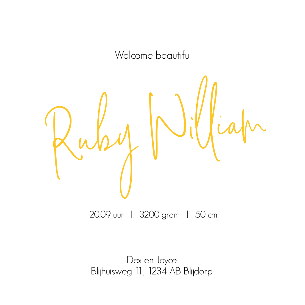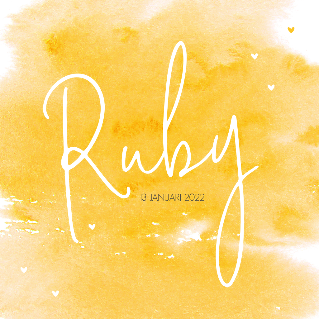 Een vrolijk geboortekaartje dat zowel voor een jongen als een meisjeskaartje te gebruiken is. Dit kaartje Ruby heeft een knallende aquarel achtergrond in de kleur geel en de naam komt in sierlijke letters erg mooi naar voren. Enkele kleine hartjes maken de kaart af. Deze kaart liever met een andere kleur? Dit is gemakkelijk aan te passen in de editor.