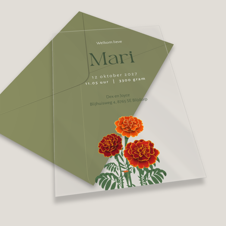 Uniek geboortekaartje voor een meisje met prachtige goudsbloemen. De goudsbloem is de geboortebloem van de maand oktober en staat voor opgewektheid, optimisme en levensvreugde. Dit vrolijke geboortekaartje Mari wordt op helder transparant acryl, ook wel plexiglas genoemd, gedrukt. Acryl geboortekaartjes zijn de allernieuwste trend! Pas de teksten, lettertypes en kleuren gemakkelijk aan in de editor.