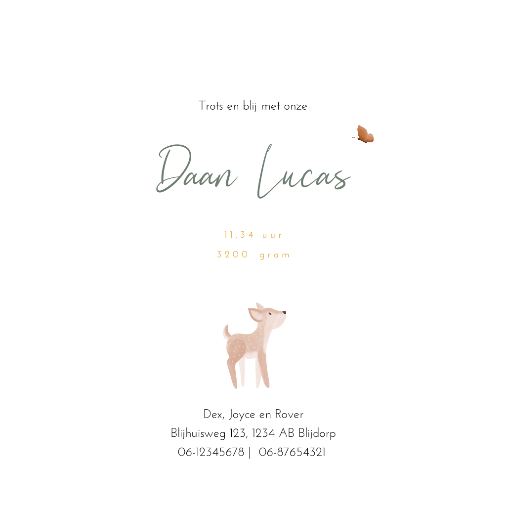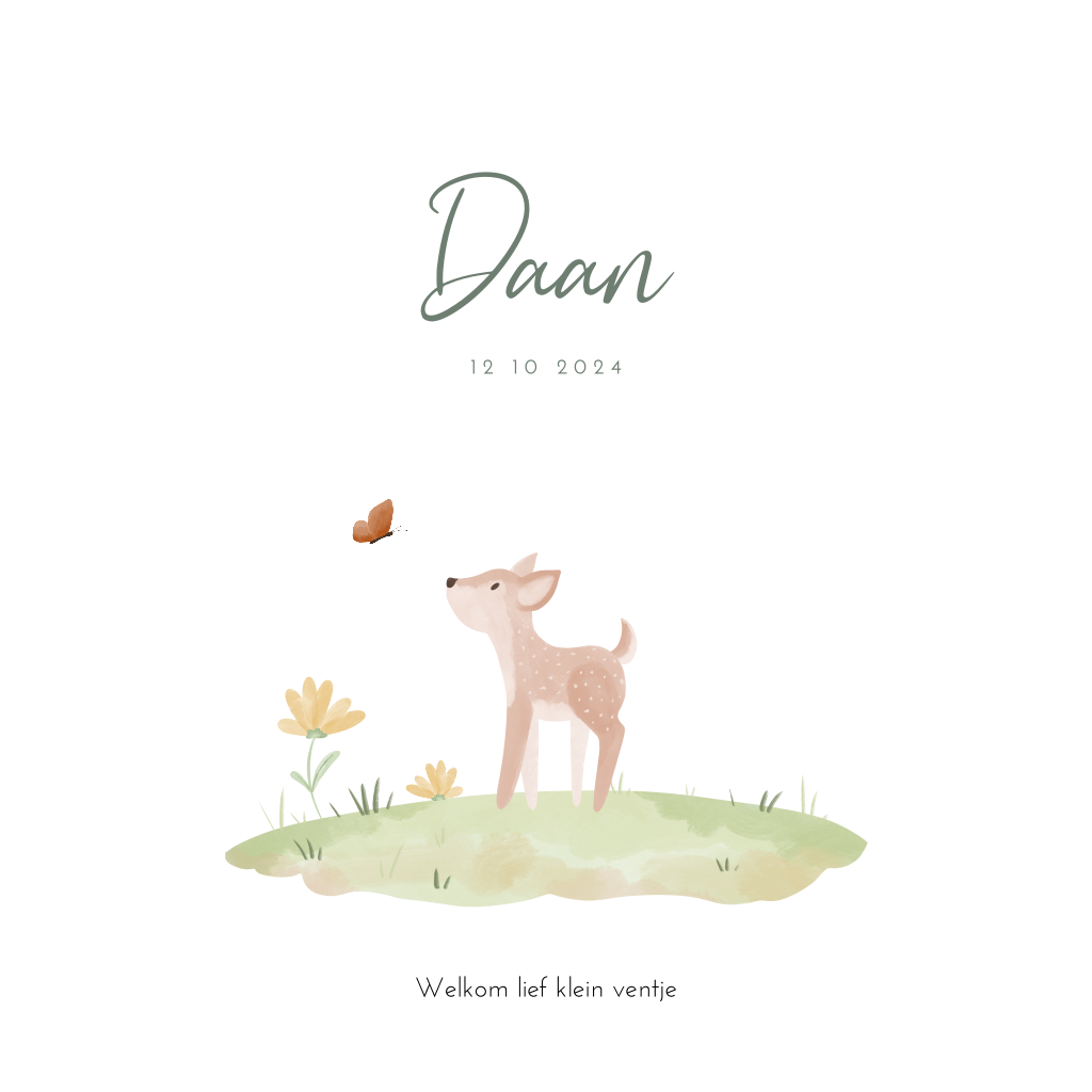 Dieren babykaartje met aquarel voor een zoon. Op dit jongens geboortekaartje met de naam Daan staat een schattig hertje. De teksten, kleuren en lettertypes zijn gemakkelijk aan te passen in de editor.