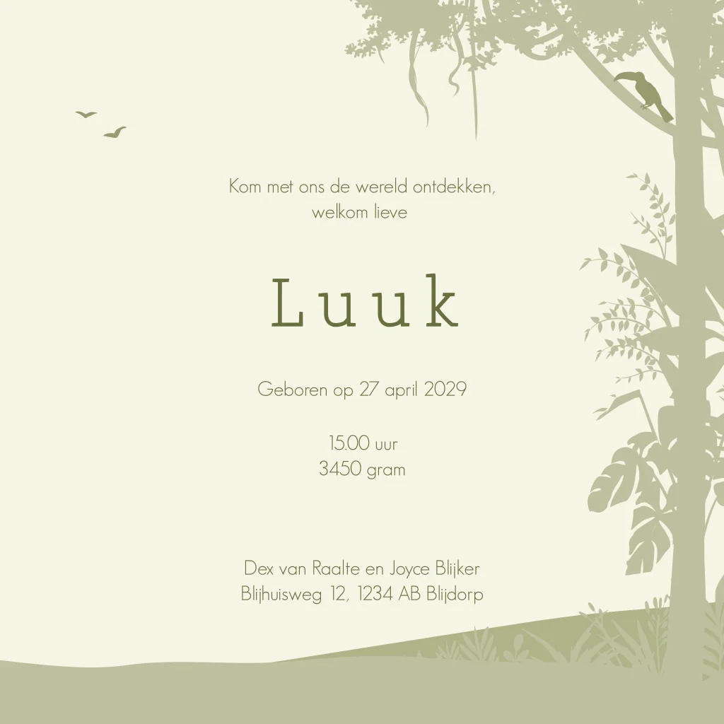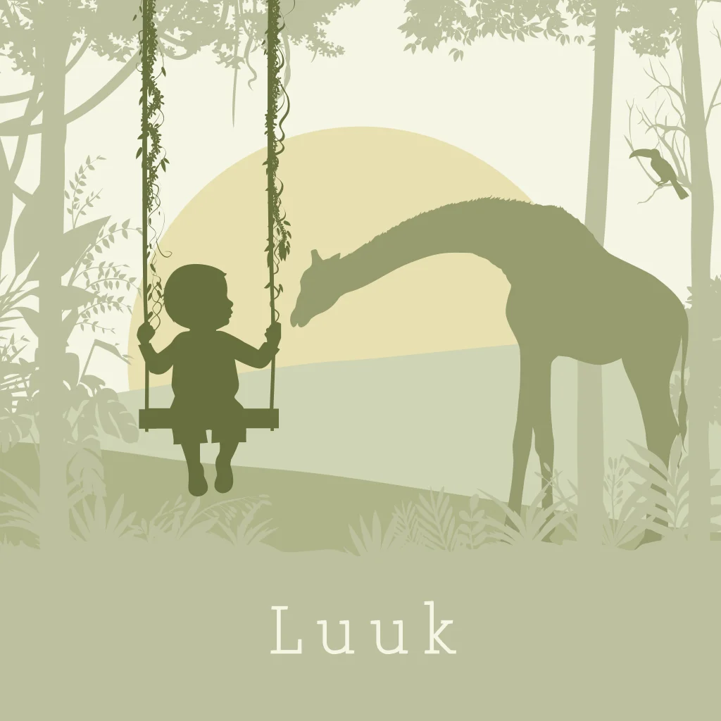 Jungle silhouet geboortekaartje voor een zoon in trendy kleuren. Op dit kaartje Luuk een jongen op een schommel, hangend aan lianen. Een toekan en giraffe kijken nieuwsgierig toe. Op de achtergrond tropische bomen. Teksten, kleuren en de silhouetten kun je gemakkelijk aanpassen in de editor.