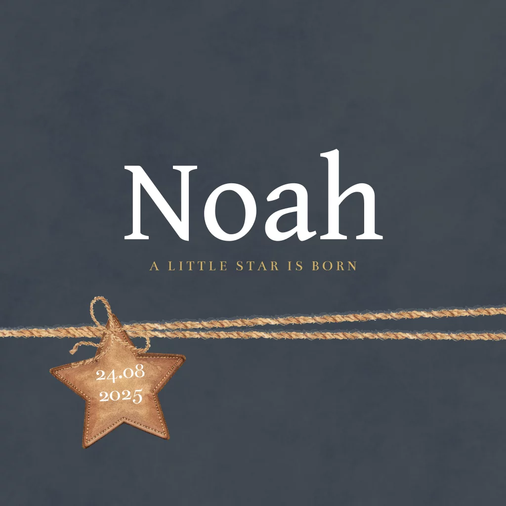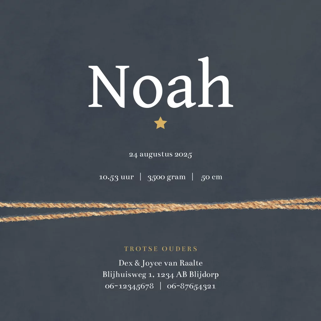 Stoer geboortekaartje voor een jongen. Op dit kaartje Noah staan touwtjes met een leren label waarin de geboortedatum staat. De naam staat in een stoer lettertype en de goudkleurige sterretjes en spetters maken het kaartje af. Kleuren en teksten zijn aan te passen in de editor.
