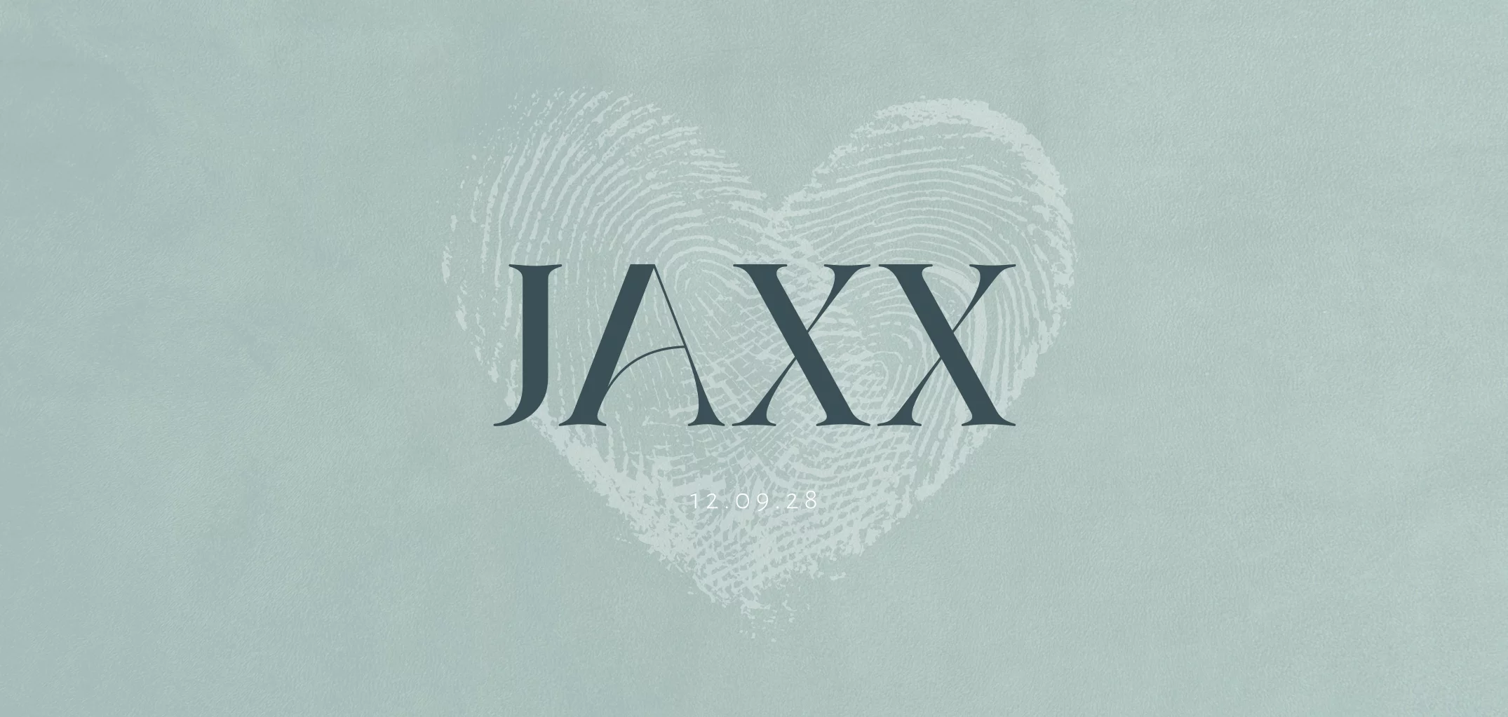 Geboortekaartje Jaxx voor een jongen in een rustig design. De achtergrond van het kaartje heeft een suède look in een blauwe kleur. Je ziet twee grote vingerafdrukken in de vorm van een hartje met de babynaam in een blauwe kleur. Pas dit fingerprint geboortekaartje naar eigen wens aan in de online editor. Maak het kaartje in stijl af met een bijpassende sluitzegel en envelop.