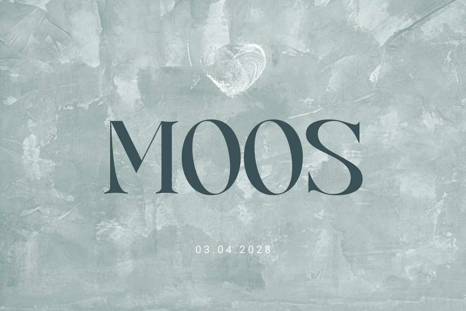 Geboortekaartje Moos voor een jongen met een rustig design. Het kaartje is in blauwe grijs tinten vorm gegeven met een betonlook patroon. Boven de babynaam zie je twee vingerafdrukken in de vorm van een hartje. Maak het kaartje geheel in stijl af met een bijpassende envelop in de kleur lichtgrijs en een mooie sluitzegel. Pas dit fingerprint kaartje naar eigen smaak aan in de online editor.