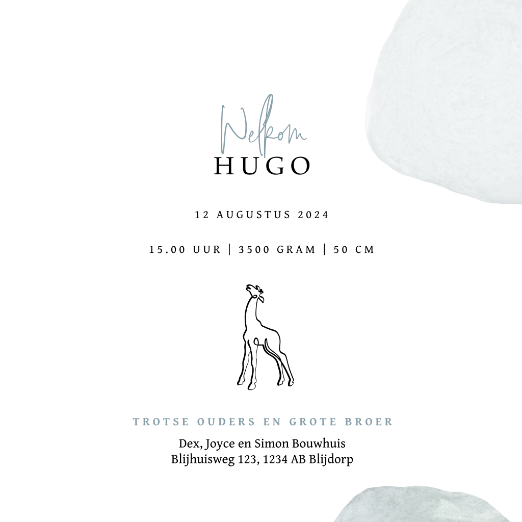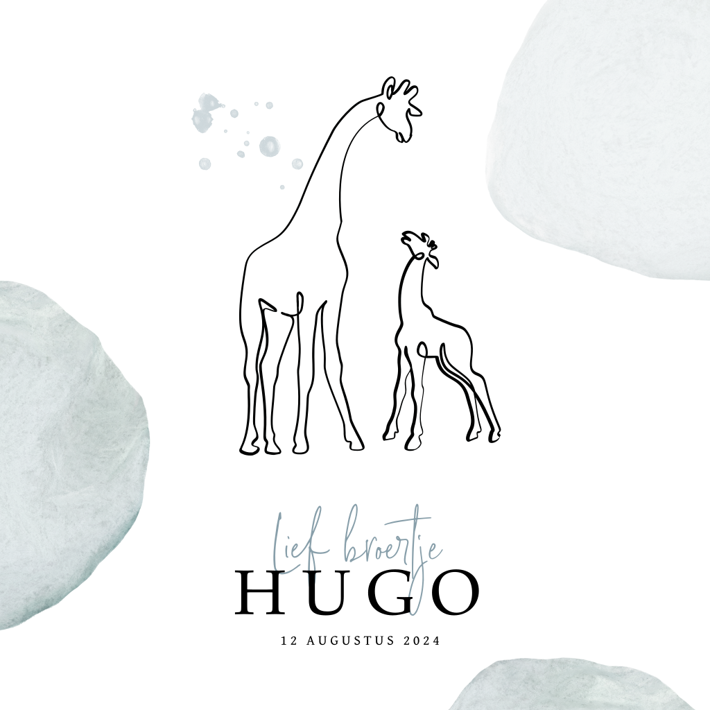Lief dieren geboortekaartje voor een tweede zoon. Op dit jongenskaartje Hugo staat een one line illustratie van 2 giraffen broertjes met daar omheen abstracte cirkels in zacht blauwe aquarel. Pas dit kaartje naar je eigen smaak aan in onze editor.