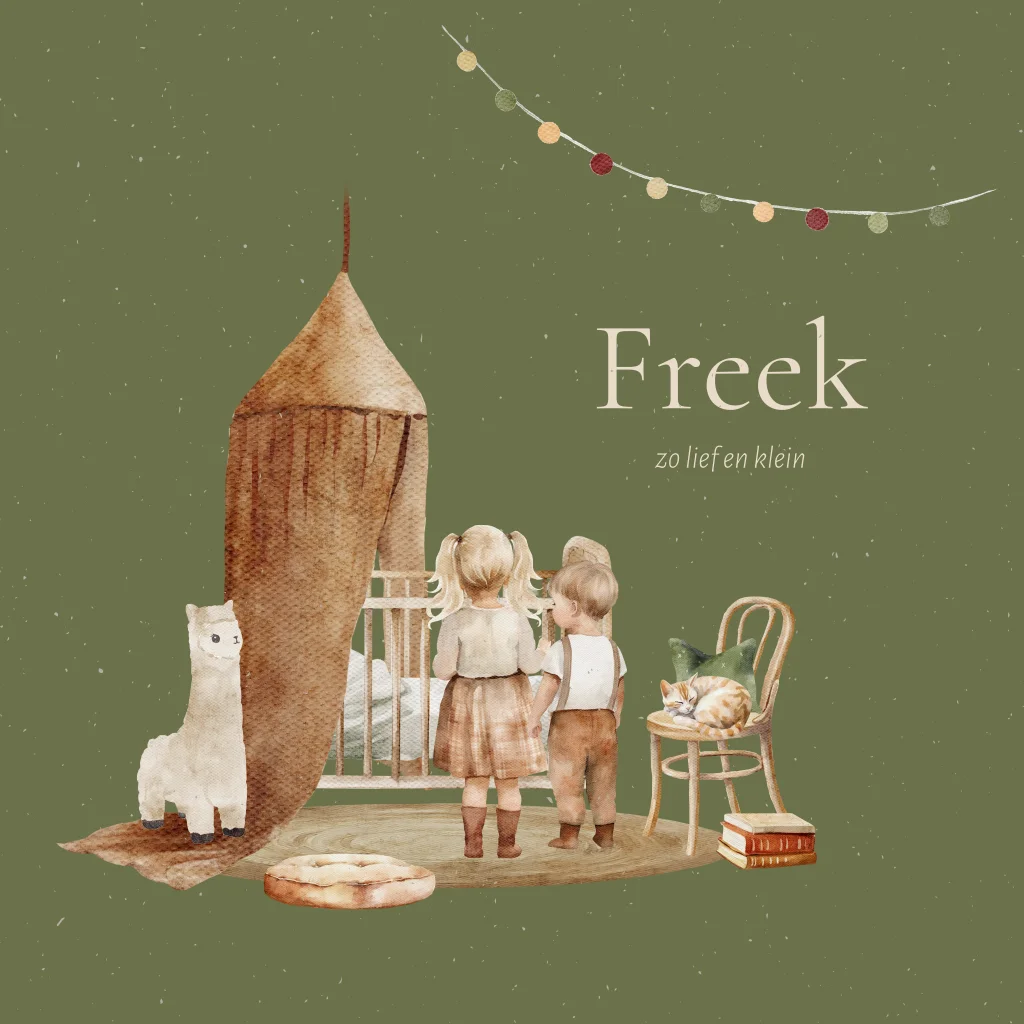Jongens geboortekaartje met een aquarel tekening, perfect voor ouders die op zoek zijn naar een geboortekaartje voor hun derde kindje. Dit geboortekaartje is ideaal voor gezinnen met zowel een broer als een zus die de komst van hun nieuwe baby broertje willen vieren. Je ziet een kinderkamer met ledikant met daarbij een grote broer en zus staan. De toevoeging van een lama knuffel en slinger voegt een vleugje speelsheid toe. Op de stoel ligt het harige gezinslid, een kat, te slapen.