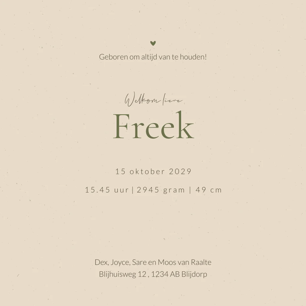 Pas dit geboortekaartje Freek eenvoudig aan in de editor. Dit kaartje is ook mogelijk in een andere gezinssamenstelling.