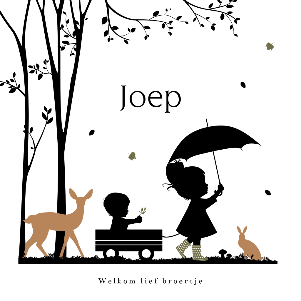 Hip herfst silhouet kaartje voor een tweede kindje, een broertje. Op dit geboortekaartje zie je een grote zus samen met haar kleine broertje in het bos. Het meisje draagt regenlaarsjes en heeft een paraplu in haar hand. Ze trekt een karretje achter haar aan waarin haar kleine baby broertje zit. Dit kaartje heeft mooie herfstkleuren en afbeeldingen van een boom, paddenstoeltjes, een hert en konijntje. Teksten en kleuren, evenals het silhouet zijn aan te passen in de editor.