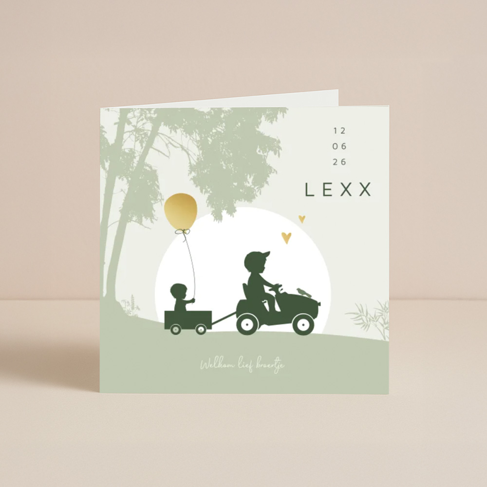 Ton-sur-ton silhouet geboortekaartje voor een tweede kindje, een zoon. Op dit jongenskaartje Lexx zie je een grote broer op de tractor zitten met in de bolderkar zijn kleine broertje die een ballon vast heeft. Op de achtergrond een grote boom in een trendy groene kleur met een ondergaande zon. De ballon en hartjes hebben een mooie goudlook. Pas het kaartje naar je eigen smaak aan in de editor. Ook mogelijk met een ander silhouet of voor een andere gezinssamenstelling.Meer inspiratie: