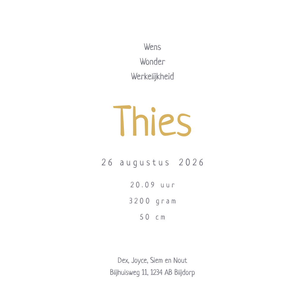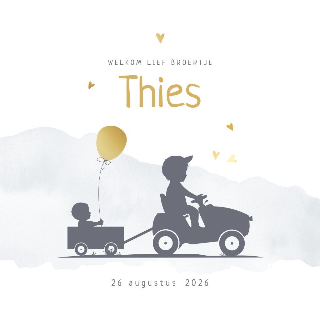 Prachtig silhouet geboortekaartje voor een tweede kindje, een zoon. Op dit jongenskaartje Thies zie je een grote broer op de tractor zitten met in de bolderkar zijn kleine broertje die een ballon vast heeft. Op de achtergrond een mooie blauw grijze aquarel. De babynaam, ballon en hartjes hebben een oker gele gouden kleur. Pas het kaartje naar je eigen smaak aan in de editor. Ook mogelijk met een ander silhouet of voor een andere gezinssamenstelling.