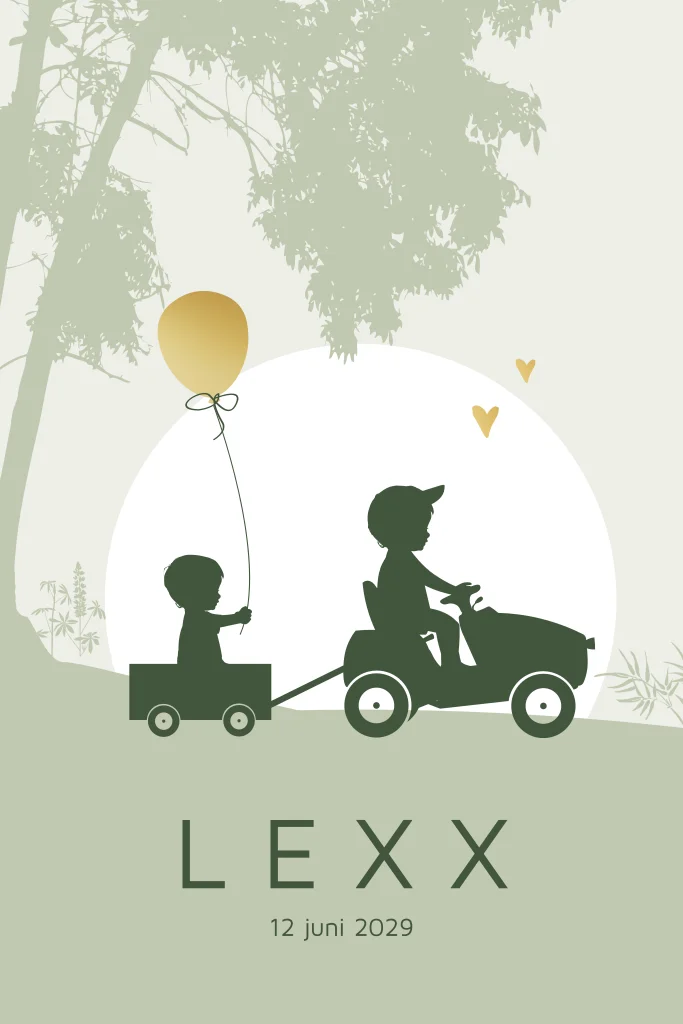 Langwerpig jongens geboortekaartje op enkel formaat. Dit geboortekaartje is voor een tweede kindje. Je ziet een grote broer op een tractor met in de kar erachter zijn kleine broertje. De kleuren van dit geboortekaartje Lexx hebben verschillende groen tinten. Pas het kaartje naar je eigen smaak aan in de editor. Ook mogelijk met een ander silhouet of voor een andere gezinssamenstelling.Meer inspiratie: