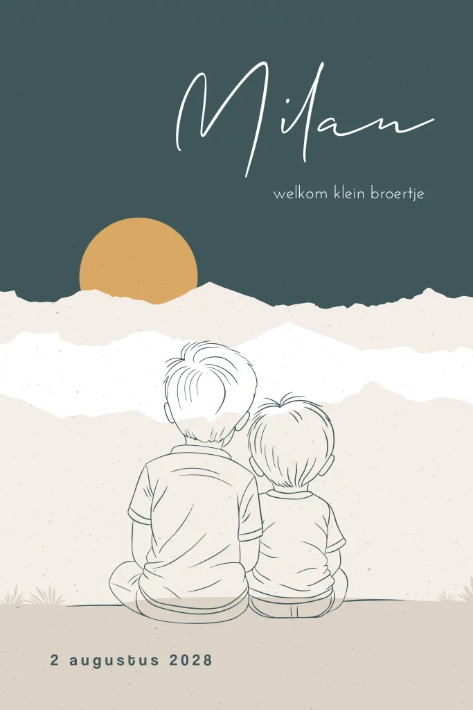 Een prachtig geboortekaartje voor een jongen. Op dit geboortekaartje Milan zie je een lijntekening van twee jongetjes. De jongetjes kijken uit op de bergen en de zon. Dit geboortekaartje voor jullie zoon bevat ronde hoeken wat zorgt voor een speels effect. Pas dit geboortekaartje naar eigen wens aan in onze online editor en maak het kaartje helemaal af met de antiek gouden envelop. Een lijntekening op maat? Stuur ons gerust een berichtje!