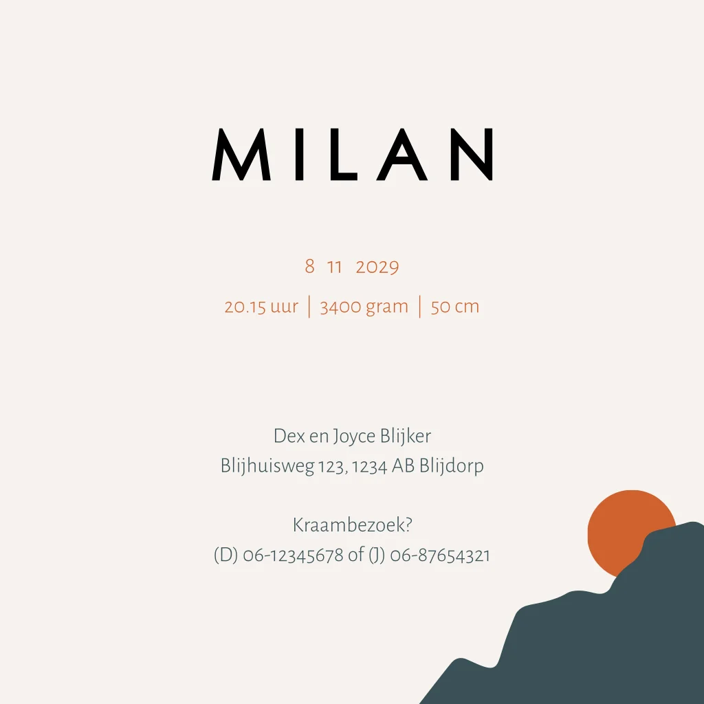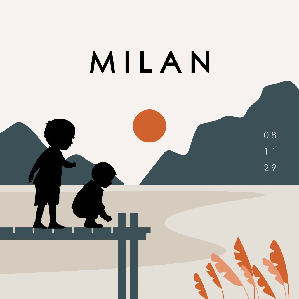 Op zoek naar een avontuurlijk en origineel geboortekaartje voor een tweede kindje? Dit geboortekaartje is perfect! Op dit jongenskaartje zie je twee silhouetjes van twee jongetjes, een grote broer met zijn kleine broertje. Samen op een steiger aan een meer met bergen en rode zon. Dit kaartje past qua kleuren perfect bij een baby die in de herfst wordt geboren. Het kaartje kun je gemakkelijk online bewerken, opslaan en bestellen. Heb je vragen of wensen? Laat het ons dan gerust weten, wij helpen je graag verder!
