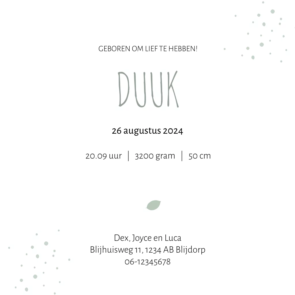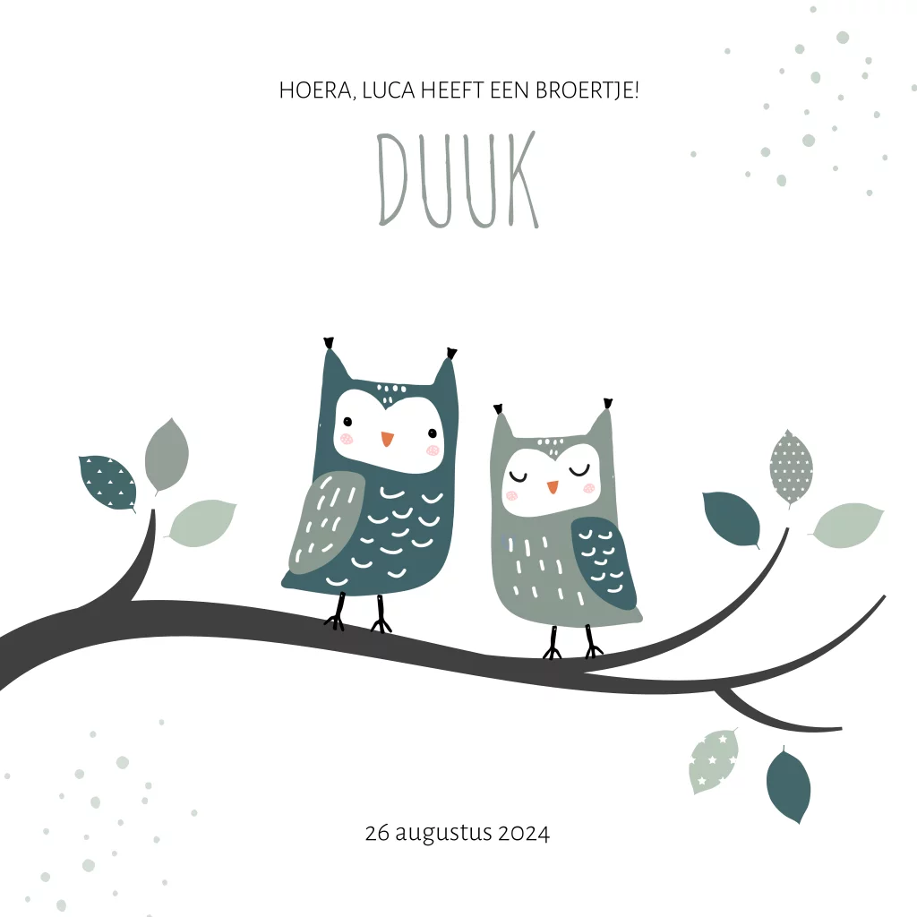Rustig geboortekaartje voor een tweede zoon. Op dit babykaartje Duuk staan twee uiltjes in groen blauwe tinten samen een een tak van een boom. Door de witte achtergrond en de zachte kleuren blijft dit kaartje een rustige uitstraling behouden.