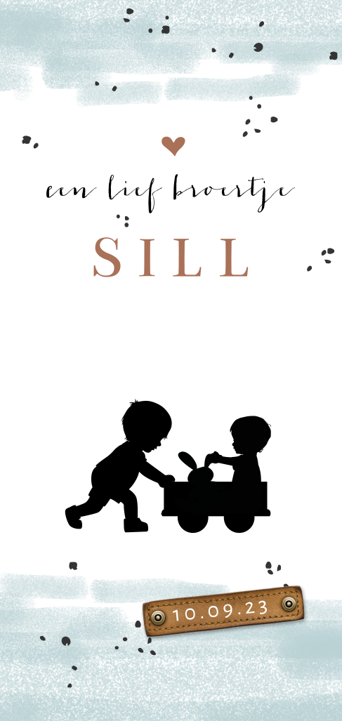 Hip geboortekaartje voor een tweede kindje (een tweede zoon) met aquarel vegen en leren label op de voorkant. Op de achterkant van het babykaartje Sill staan de geboortegegevens ook in leren labeltjes. Super leuk geboortekaartje welke gemakkelijk is aan te passen.