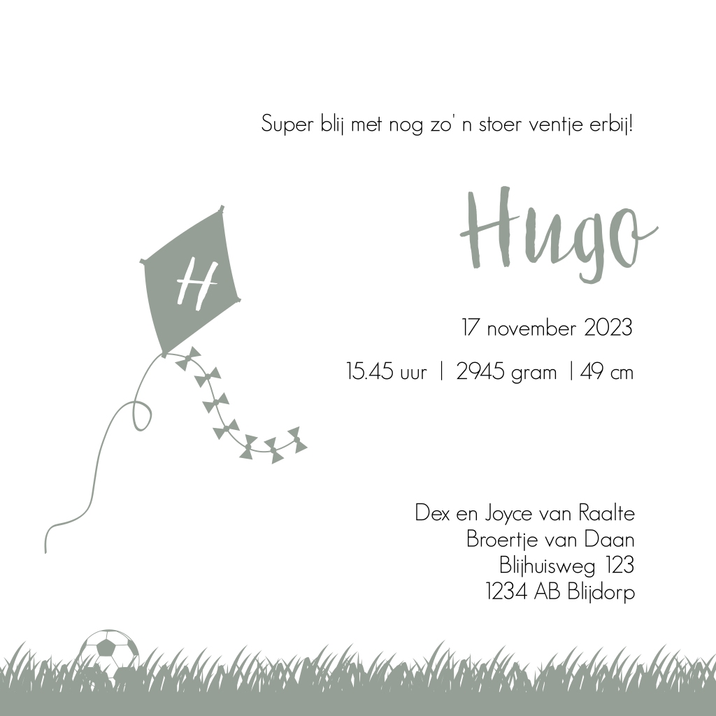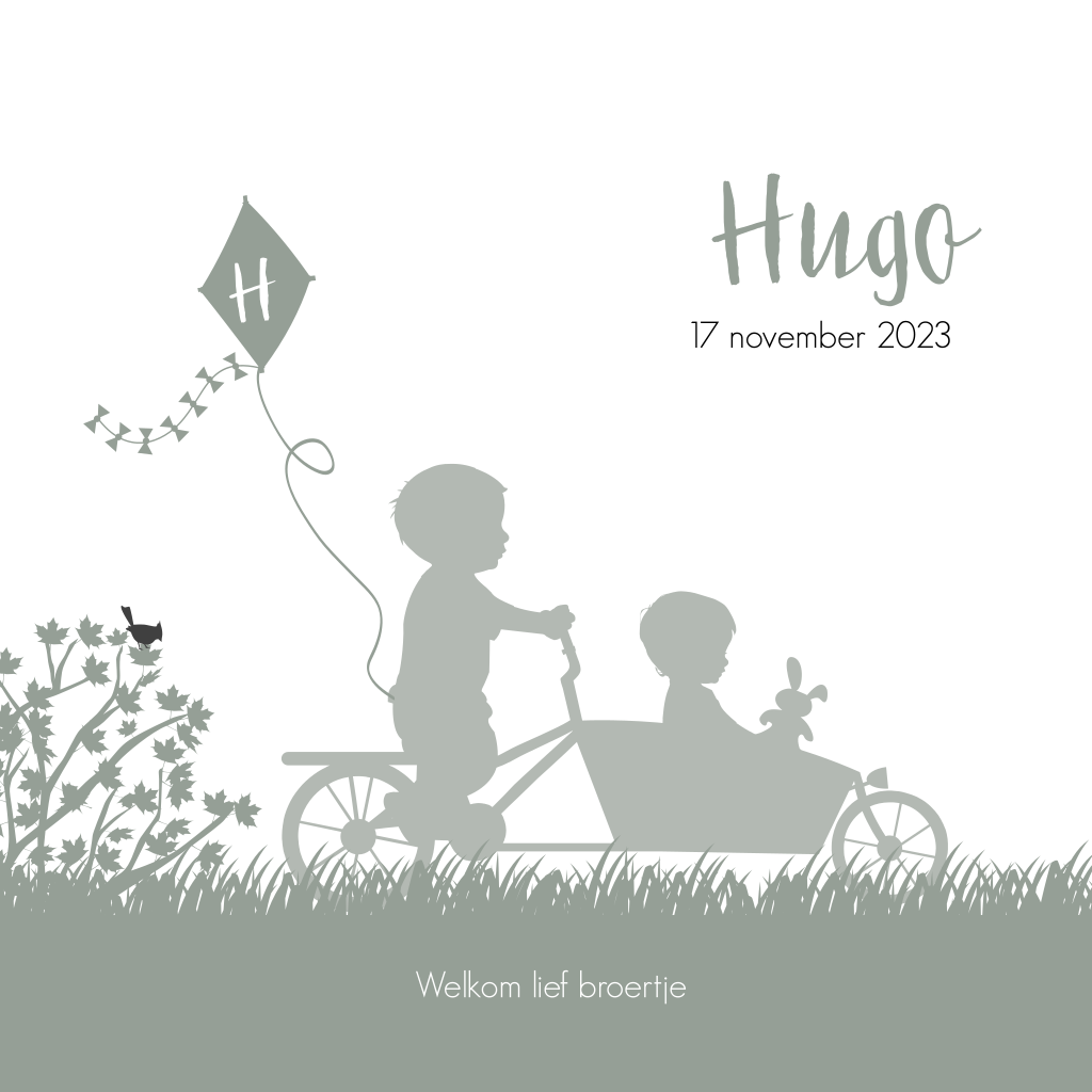 Silhouet geboortekaartje voor een tweede kindje, een tweede zoon. Op dit kaartje Hugo zie je een grote broer op de bakfiets met een vlieger. In de bakfiets zit een klein baby broertje met een knuffeltje.