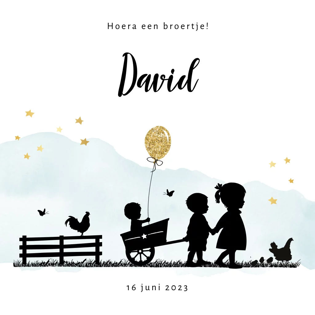 Silhouet geboortekaartje voor een derde kindje, een jongen. Op dit baby kaartje met de naam David staan een grote zus en een grote broer samen met hun kleine baby broertje. Het kleine baby broertje zit in een karretje met een goudkleurige ballon in zijn hand. Op de achtergrond een aquarel in de kleur zacht blauw. Verder op dit kaartje kleine gouden sterretjes, kippen en een vlindertje. Dit silhouet kaartje voor een derde kind is gemakkelijk aan te passen en ook mogelijk in een andere gezinssamenstelling.