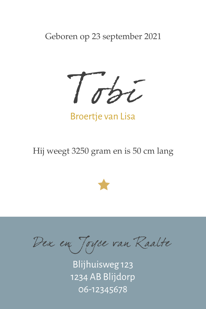 Geboortekaartje met een silhouet van een grote zus samen met een klein broertje op de fiets. Het de grote zus houdt een goudkleurige ballon vast. De vlinder en knuffels maken het kaartje af. Dit babykaartje voor een tweede kindje heeft grotendeels een grijsblauwe kleur.