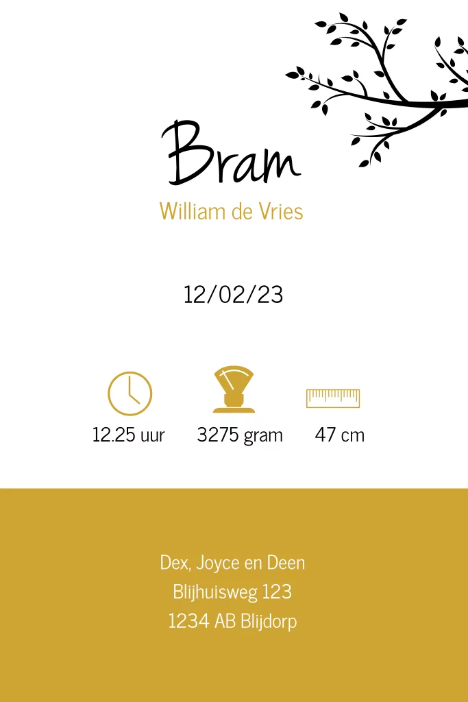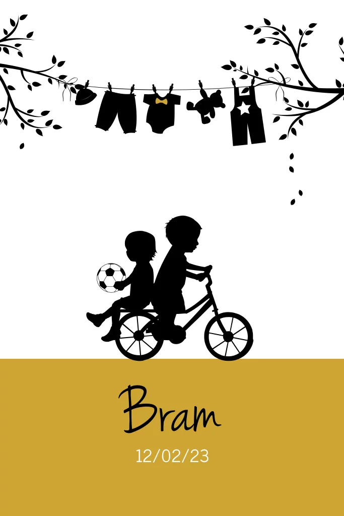 Silhouet geboortekaartje voor een tweede kindje. Op het kaartje zit een grote broer op de fiets met zijn kleine broertje achterop. Aan de boomtakken hangt een waslijn met babykleertjes.