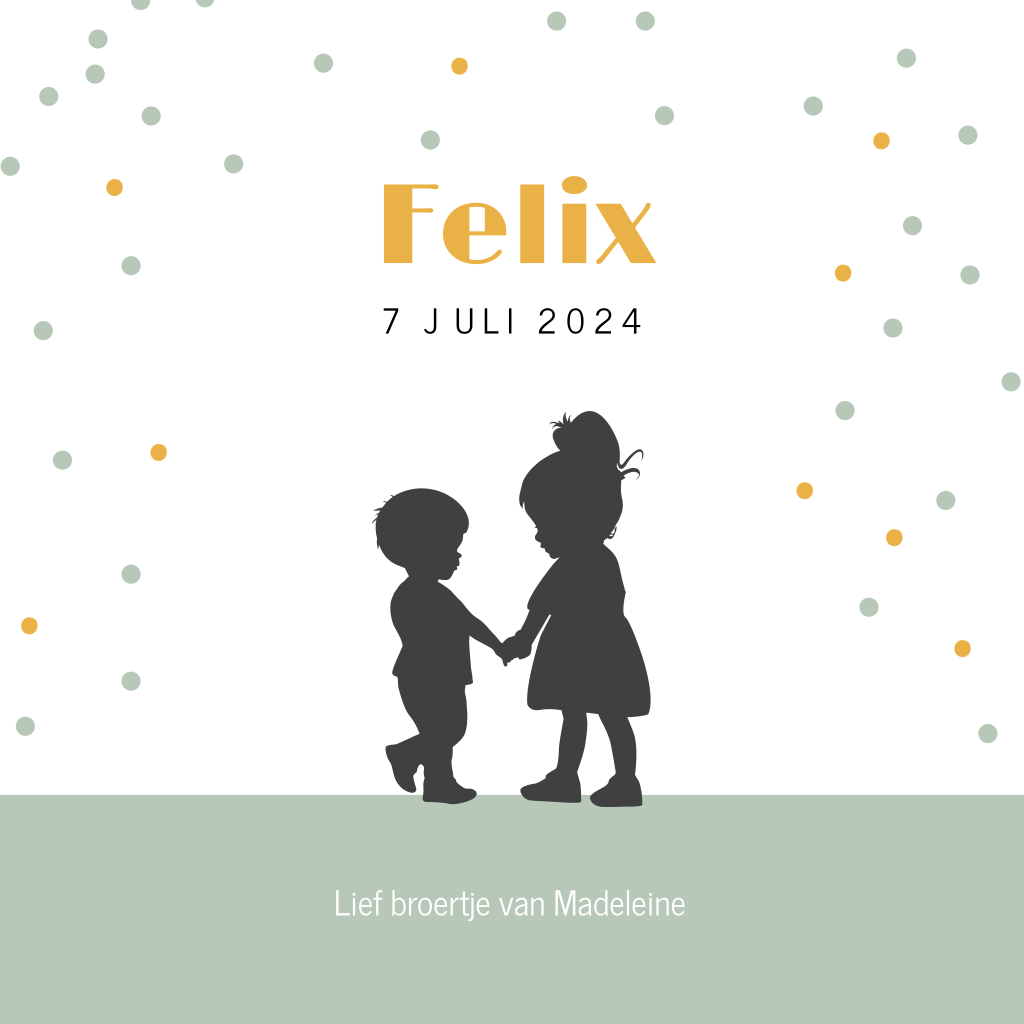 Silhouet geboortekaartje voor een baby broertje. Op dit kaartje staat een grote zus hand in hand met een klein broertje. De stippen maken een vrolijk geheel.