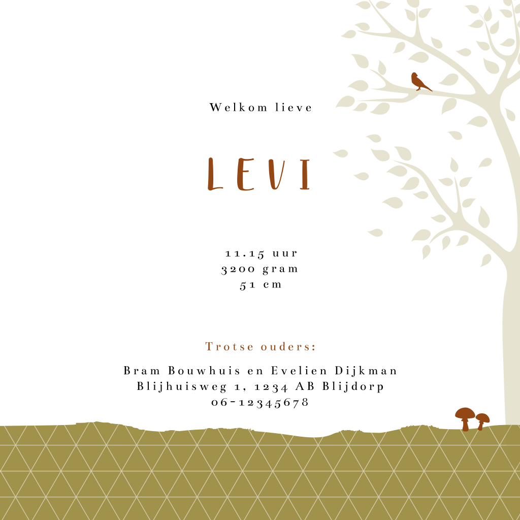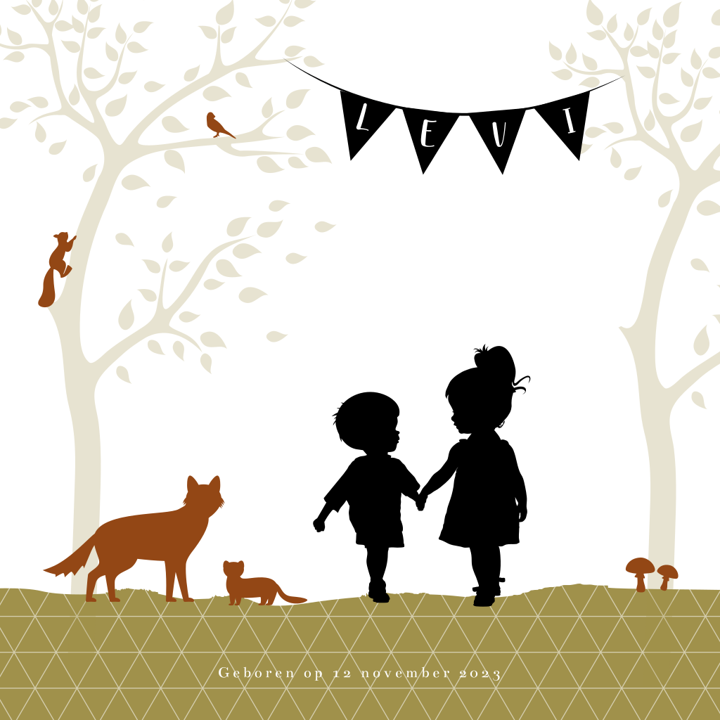 Mooi herfst geboortekaartje van een grote zus hand in hand met haar kleine broertje. Aan de bomen hangt een slinger met de babynaam Levi erop. Verder op dit silhouet kaartje bomen, paddenstoeltjes en verschillende bos dieren, waaronder een eekhoorn en een vos. Teksten en kleuren zijn naar wens aan te passen. Ook mogelijk met een ander silhouet.