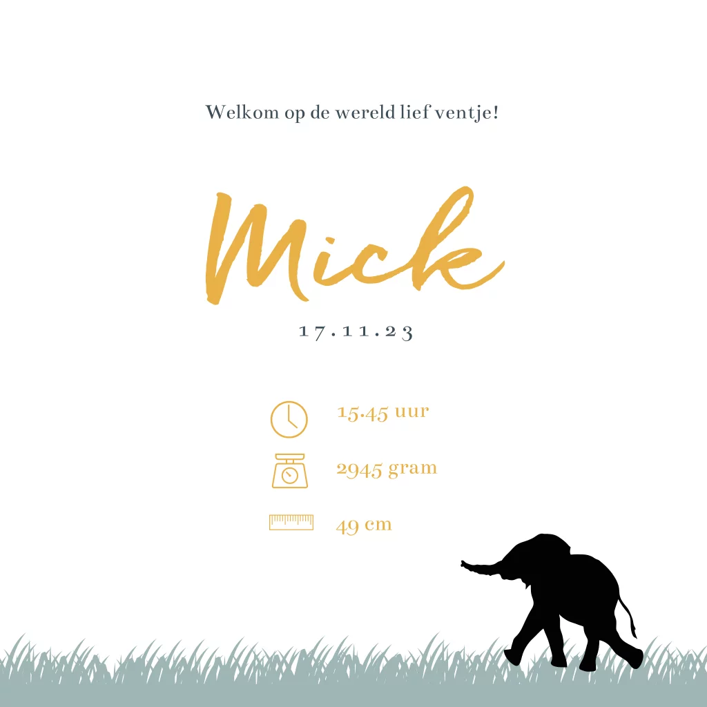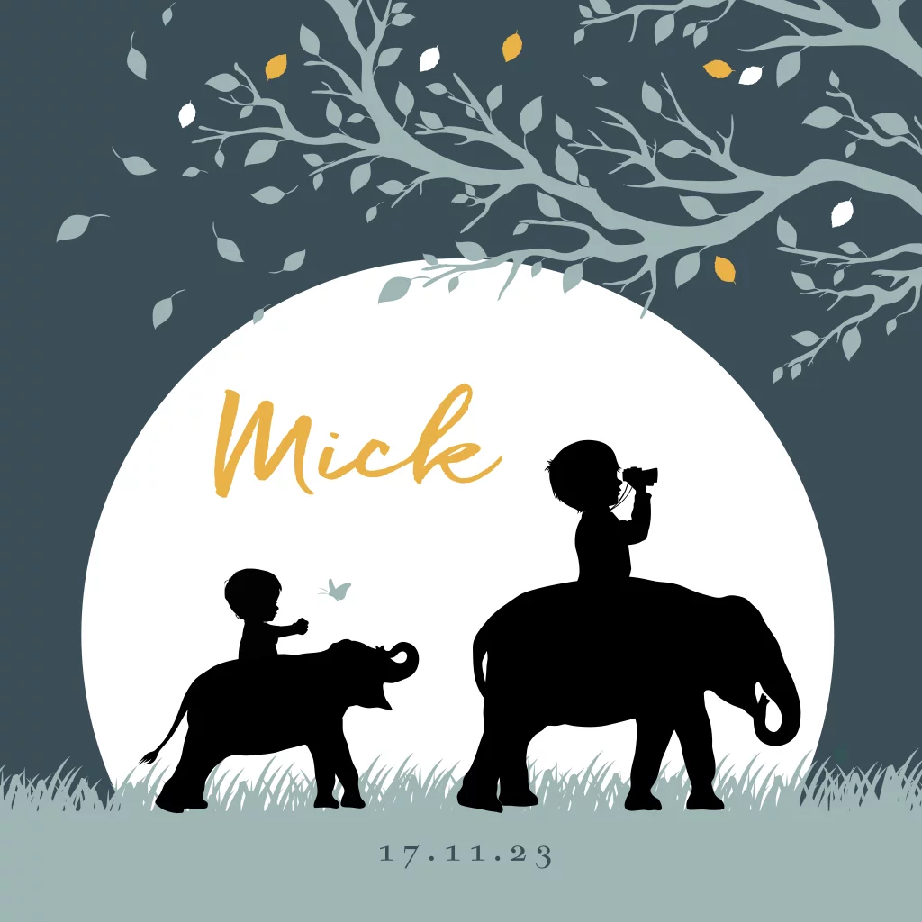 Hip silhouet geboortekaartje voor een tweede jongen. Op dit jungle kaartje Mick gaat een grote broer op olifanten safari met zijn kleine baby broertje. De teksten en kleuren van dit kaartje kun je aanpassen in de editor.