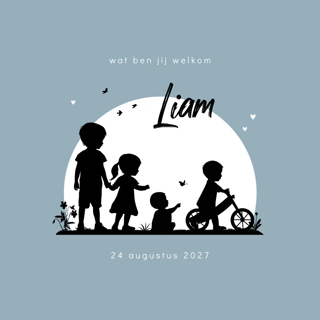 Lief silhouet geboortekaartje voor een vierde kindje, een zoon. Een groot gezin is bijzonder en verdient een uniek geboortekaartje. Dit silhouet geboortekaartje voor een jongen bevat een silhouetje van broertjes en zusjes. De grote broer en zus staan hand in hand, het kleine broertje op een loopfietsje en kleine baby broertje zit op de grond. Op de achtergrond een zon met vogels, hartjes en vlindertje. Pas de kleuren, lettertypes en teksten gemakkelijk aan in de editor. Dit kaartje Liam kun je ook gebruiken voor een andere gezinssamenstelling.