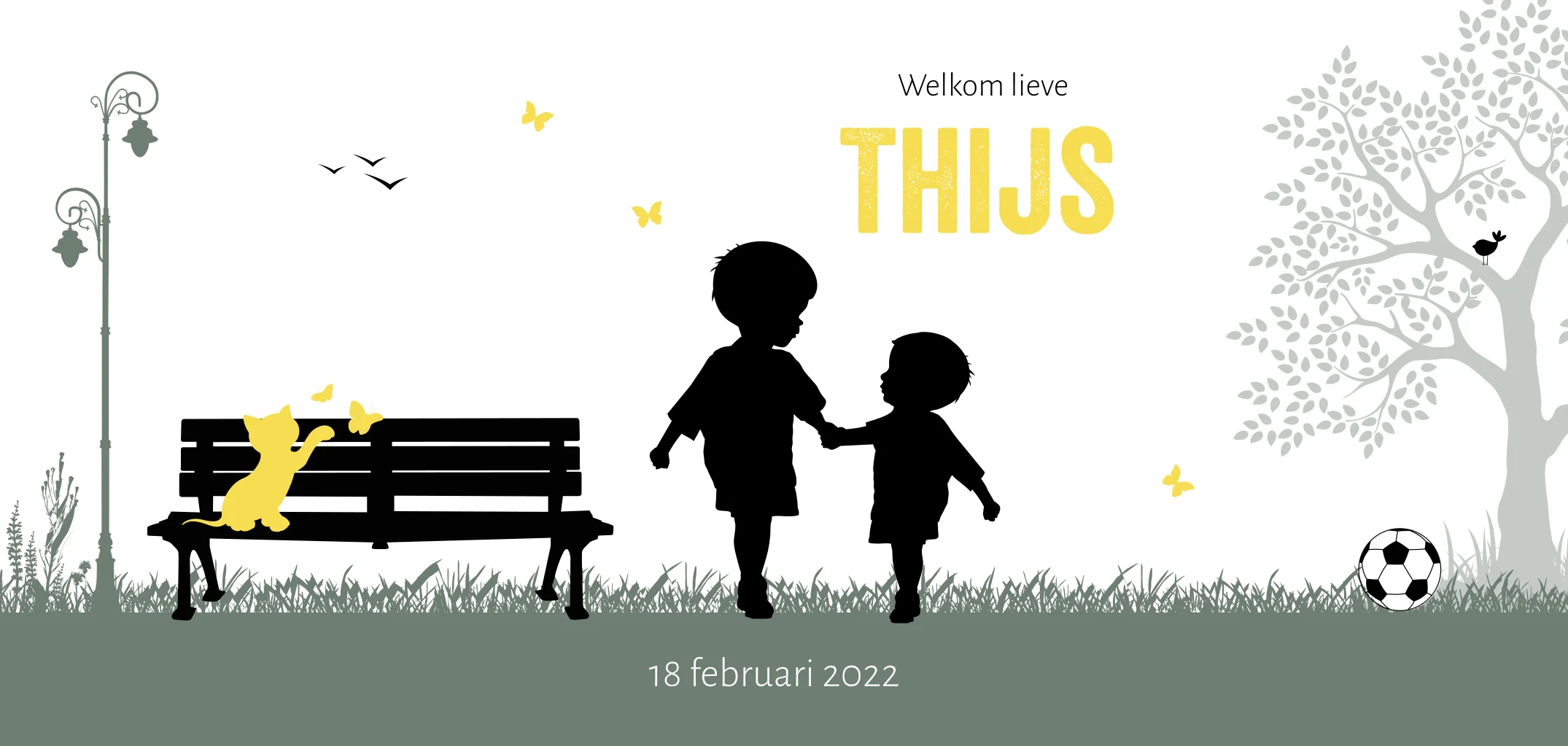 Geboortekaartje in een stadse omgeving met een silhouet van een grote broer hand in hand met zijn kleine broertje. Dit geboortekaartje Thijs is voor een tweede kindje, maar ook andere combinaties zijn mogelijk. De hippe kleurencombinatie groen en geel maken het kaartje ook stoer. Overige elementen op deze kaart zijn een voetbal, bankje, poesje en lantaarn. De kleuren op dit kaartje zijn aan te passen.
