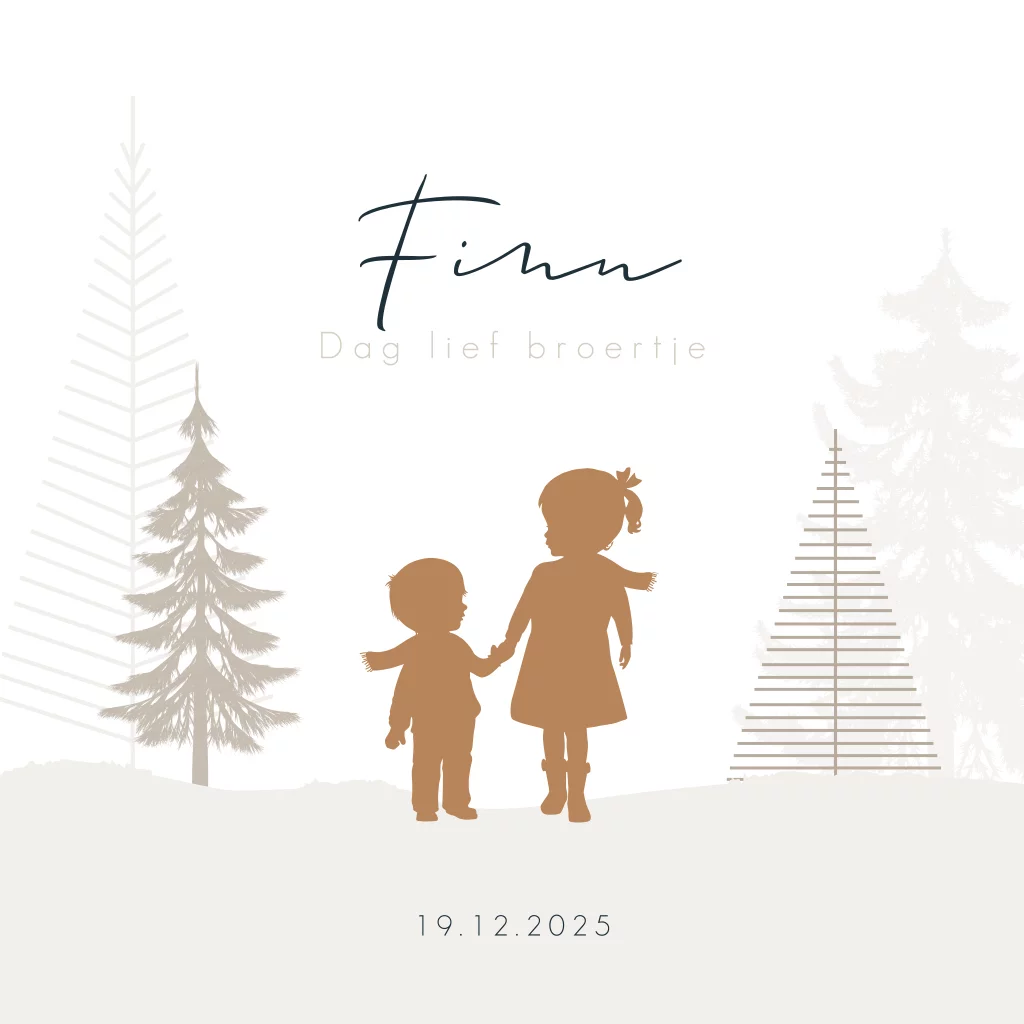 Winter silhouet geboortekaartje voor een tweede kindje, een zoon. Op dit jongenskaartje Finn staat een grote zus hand in hand met haar kleine broertje in de sneeuw. Op de achtergrond bergen in aquarel en winterse bomen. Teksten en kleuren, evenals de silhouetten zijn aan te passen in de editor. Ook mogelijk voor een andere gezinssamenstelling. Hulp nodig bij het aanpassen van deze kaart? We helpen je graag!
