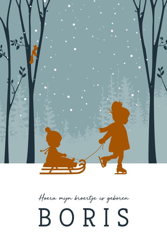 Hip silhouet geboortekaartje in winterse sferen voor een tweede kindje, een zoon. Op dit kaartje Boris zit een klein baby broertje op de slee die wordt voortgetrokken door een grote zus op schaatsen. Op de achtergrond winterse bomen en dwarrelende sneeuwvlokjes. Een trendy kleurencombinatie van blauw met wit en roestbruin. De teksten en kleuren, evenals de silhouetten, zijn aan te passen in de editor.