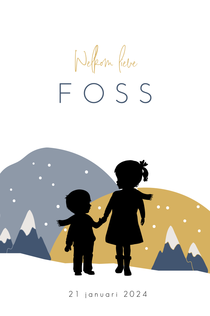 Winters silhouet kaartje van een grote zus met haar kleine broertje in de sneeuw. Dit kaartje Foss heeft trendy kleuren, bergen en dwarrelende sneeuwvlokjes. Ook mogelijk met een ander silhouet of andere kleuren.